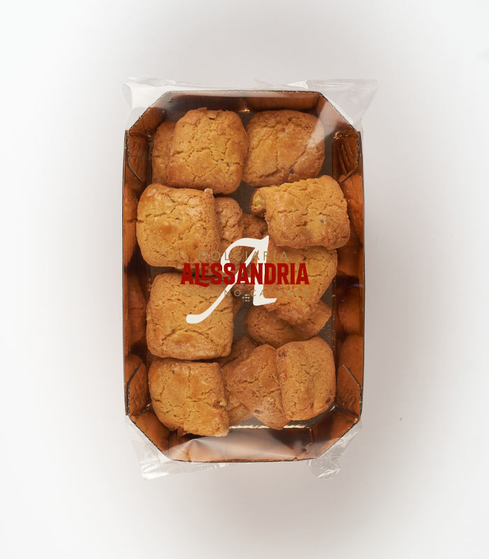 Ingredienti: farina di GRANO tenero tipo ’00’, zucchero, margarina vegetale, UOVA intere pastorizzate, MANDORLE, agente lievitante: difosfato disodico. amido di MAIS, bicarbonato acido di sodio, aromi. Colorante E 100-E110. Contiene GLUTINE. Possibili tracce di: SOIA, SENAPE, LUPINO. Conservare in luogo fresco ed asciutto